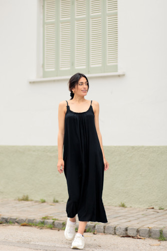 Airy, crinkled viscose, cool, backless, loose-fitting, long dress with pockets on both sides.